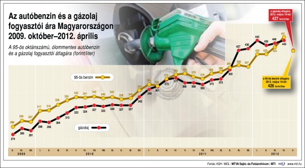 A benzin ára az idén április elején érte el csúcsát, akkor egy liter átlagosan 451 forintba került. A gázolaj január közepén volt a legdrágább, akkor egy liter átlagosan 449 forint volt.
