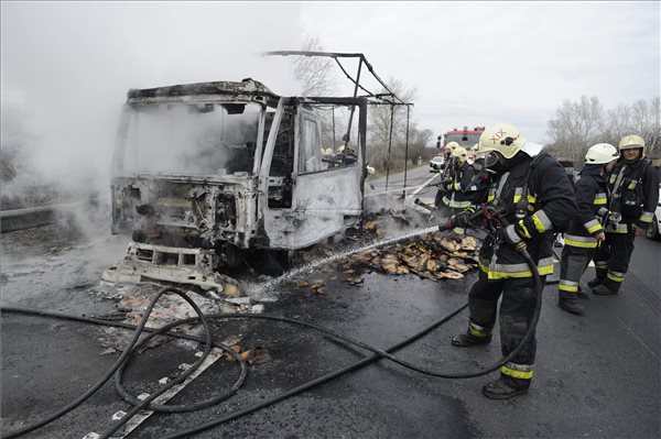 Tűzoltók dolgoznak az M5-ös autópálya gyáli lehajtóján, ahol kigyulladt egy papírárut szállító kisteherautó 2014. február 24-én. Mire a fővárosi tűzoltók a helyszínre értek, a jármű és annak rakománya már teljes terjedelmében égett, s a tűz az út melletti bozótos, füves terület 50 négyzetméteres részére is átterjedt. A tüzet megfékezték, a sofőrt a mentők kórházba vitték.
