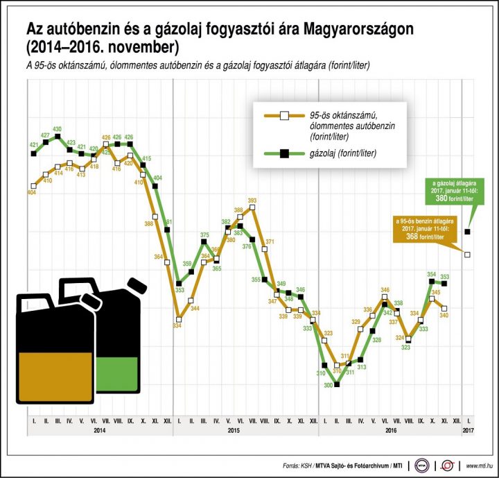 A benzinár 2012. április elején érte el csúcsát, akkor egy liter átlagosan 451 forintba került. A gázolaj literje 2012. január közepén volt a legdrágább, átlagosan 449 forint.