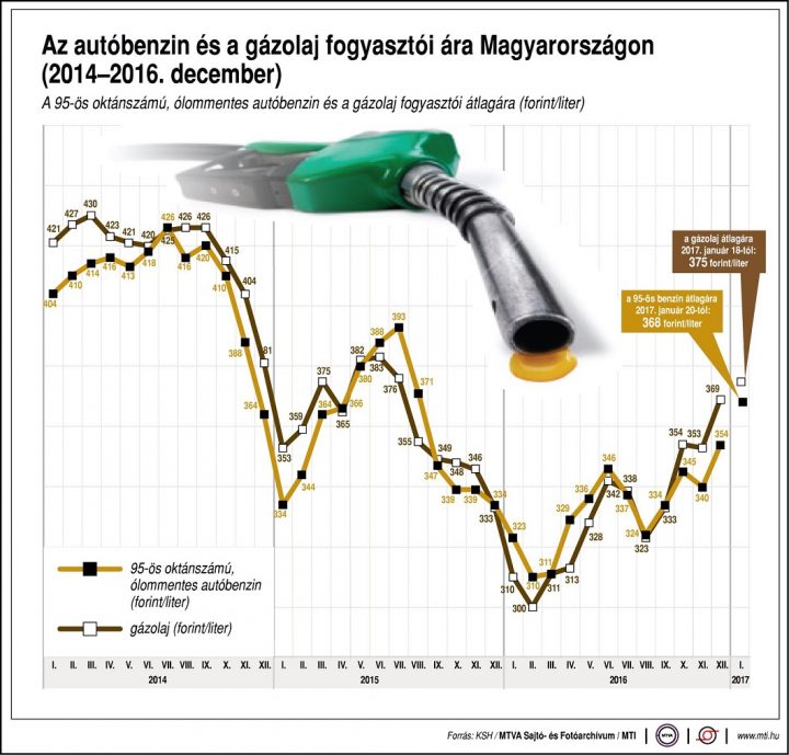 A benzinár 2012. április elején érte el csúcsát, akkor egy liter átlagosan 451 forintba került. A gázolaj literje 2012. január közepén volt a legdrágább, átlagosan 449 forint.