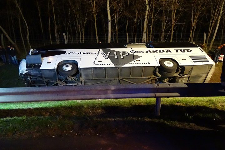 A tájékoztatás szerint a baleset a 132-es kilométernél történt, az oldalára borult menetrend szerint közlekedő távolsági autóbusz bolgár nemzetiségű. A mentés idején forgalomkorlátozásra kell számítani.