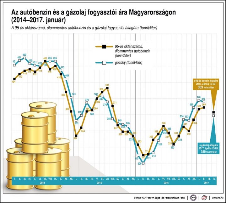 Az autósok 50 forintos különbséget is tapasztalhatnak a töltőállomások árai között. A benzinár 2012. április elején érte el csúcsát, akkor egy liter átlagosan 451 forintba került. A gázolaj literje 2012. január közepén volt a legdrágább, átlagosan 449 forint.