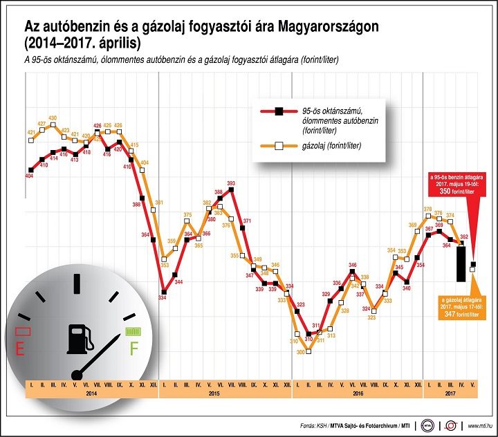 Az autósok 50 forintos különbséget is tapasztalhatnak a töltőállomások árai között. A benzinár 2012. április elején érte el csúcsát, akkor egy liter átlagosan 451 forintba került. A gázolaj literje 2012. január közepén volt a legdrágább, átlagosan 449 forint.