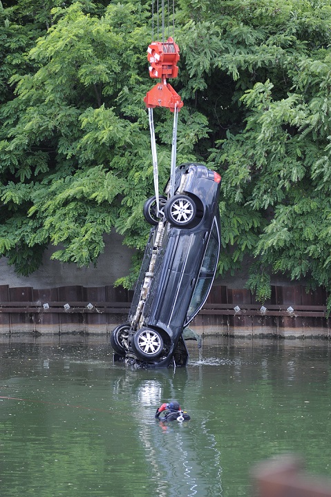 A jármű két utasa kijutott a vízzel teli gödörből, őket a mentők vizsgálják. A gépkocsi elmerült, és búvárok segítségével a tűzoltók fogják kiemelni.
