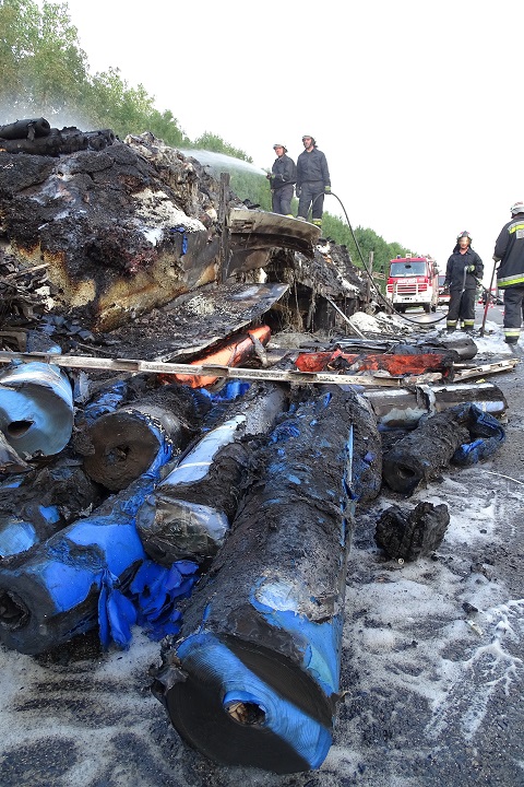 Kiégett kamion az M5-ös autópálya Szeged felé vezető oldalán Kecskemét közelében 2017. július 10-én. MTI Fotó: Donka Ferenc