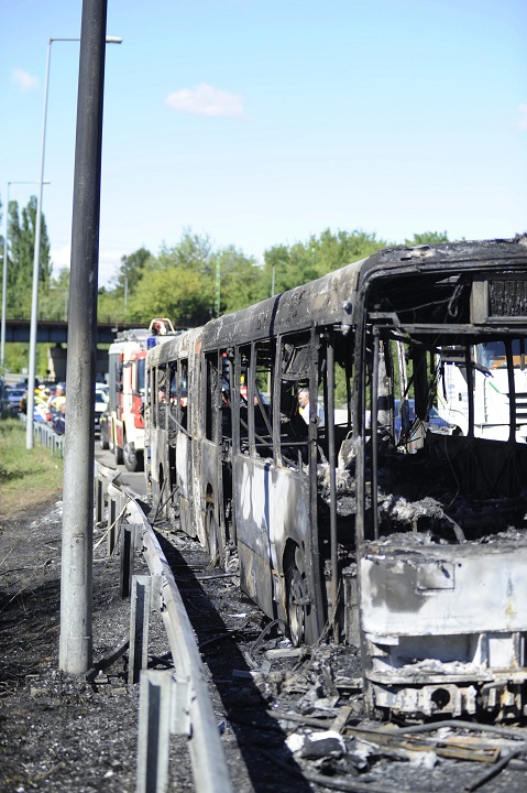 Kiégett, menetrend szerint közlekedő csuklós autóbusz az M1-es és az M7-es autópálya közös szakaszán, Törökbálint közelében, a Budapest felé vezető oldalon 2017. július 13-án. A buszon negyvenen-ötvenen utaztak, őket a sofőr még időben leszállította a járműről. MTI Fotó: Mihádák Zoltán