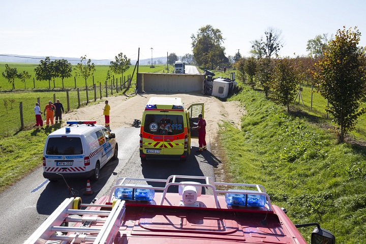 Oldalára dőlt kamion a Nagykanizsa és Surd közötti úton 2017. október 16-án, miután a teherjármű összeütközött egy személyautóval. Az autót vezető 71 éves férfi a helyszínen meghalt. A búzát szállító teherautó az oldalára borult, rakománya az úttestre dőlt. MTI Fotó: Varga György