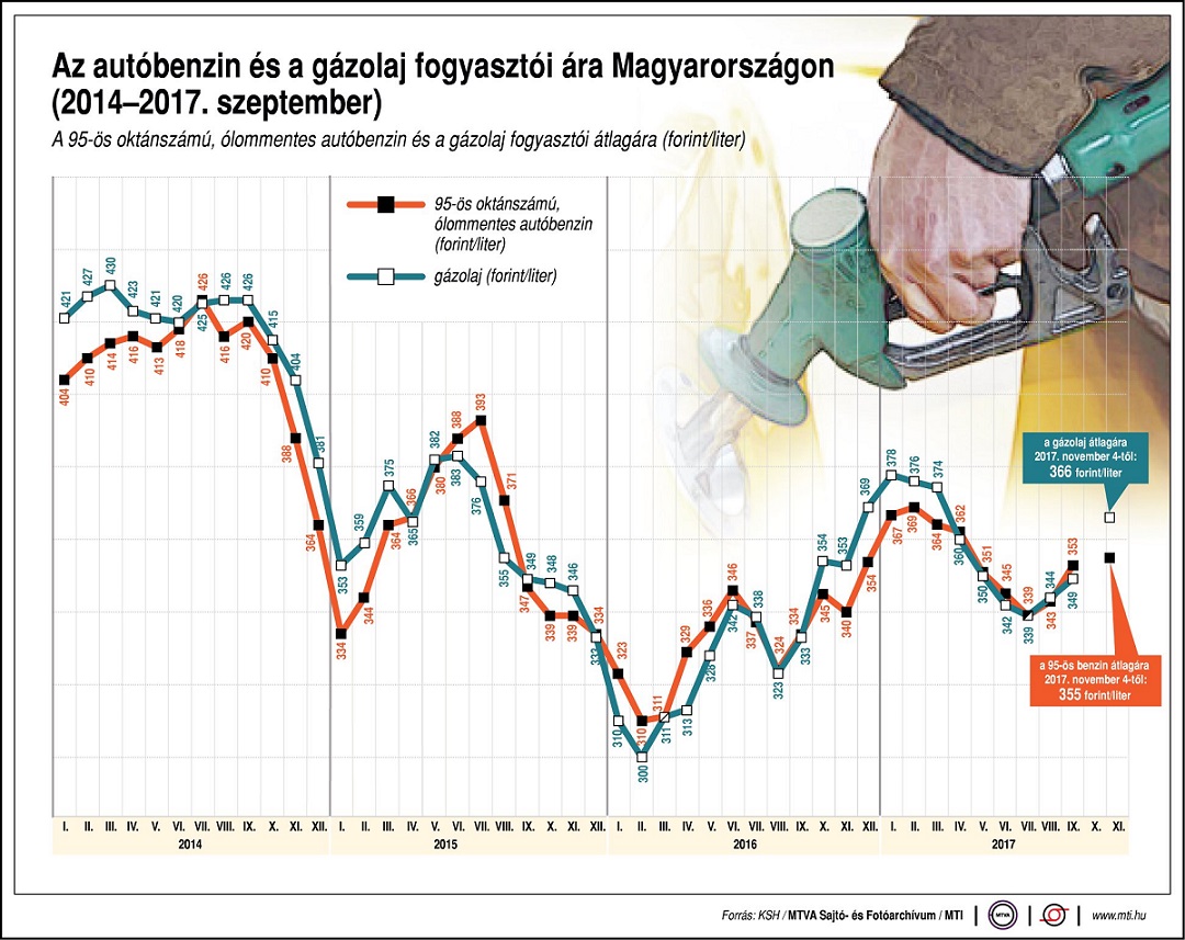 Az autósok 50 forintos különbséget is tapasztalhatnak a töltőállomások árai között. A benzinár 2012. április elején érte el csúcsát, akkor egy liter átlagosan 451 forintba került. A gázolaj literje 2012. január közepén volt a legdrágább, átlagosan 449 forint.
