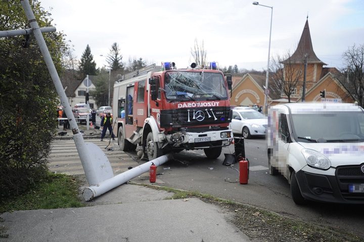 Összetört tűzoltóautó és kisteherautó Szentendrén, a Dunakanyar körút és a Szent István utca kereszteződésében, ahol a két gépjármű összeütközött 2017. december 6-án. A balesetben egy ember megsérült. MTI Fotó: Mihádák Zoltán