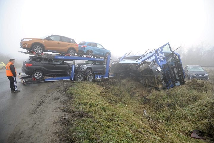 Tetejére borult autószállító tréler Zsámbék külterületén 2017. december 8-án, miután az új autókat szállító jármű a sűrű ködben letért az útról és az árokba borult. Erre a napra több megyére is figyelmeztetéseket adtak ki a tartós, sűrű köd, valamint a sok eső veszélye miatt. MTI Fotó: Mihádák Zoltán