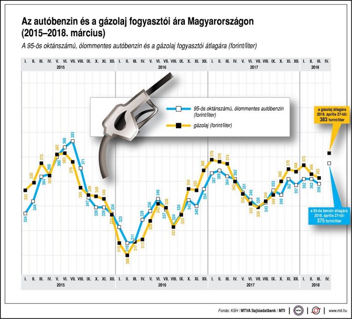 Az emeléssel a benzin literenkénti átlagára 375 forintra nő, a gázolajé pedig 383 forintra emelkedik. Az üzemanyagok ára legutóbb április 18-án változott, akkor a benzin 2 forintos emeléssel 369 forintra, a gázolaj 6 forintos emeléssel 377 forintra drágult.