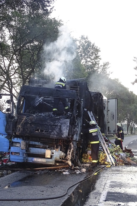 Tűzoltók dolgoznak egy kigyulladt kamionnál a 44-es főúton, Kecskemétnél 2018. augusztus 29-én. A balesetben senki sem sérült meg. MTI Fotó: Donka Ferenc