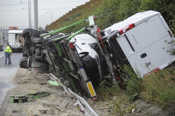 Árokba borult és az oldalára dőlt egy autószállító kamion az M0-ás autóút 10-es kilométerszelvényénél 2018. szeptember 3-án. A kamion egy másik teherjárművel ütközött, a balesetben nem sérült meg senki.