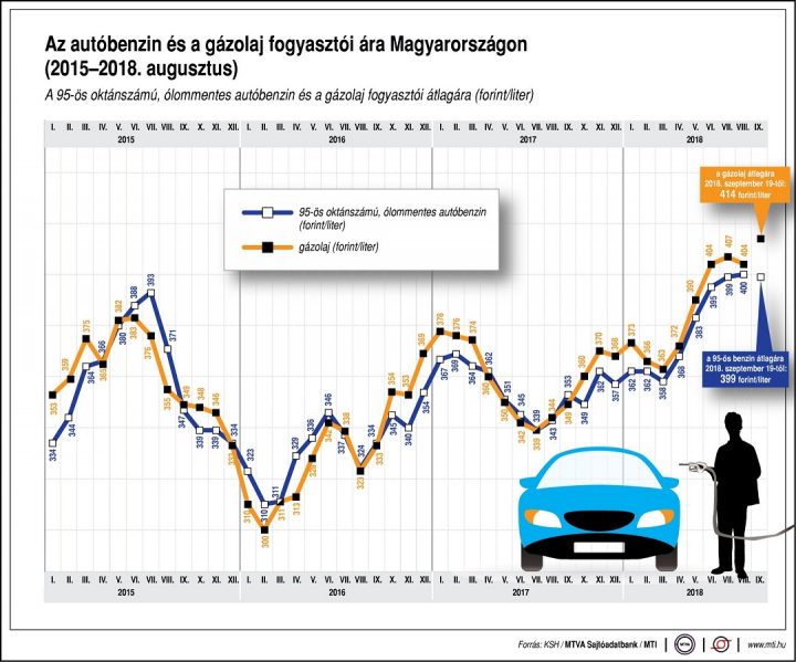 Az autósok 50 forintos különbséget is tapasztalhatnak a töltőállomások árai között. A benzin ára 2012. április elején érte el csúcsát, akkor egy liter átlagosan 451 forintba került. A gázolaj literje 2012. január közepén volt a legdrágább, átlagosan 449 forint.