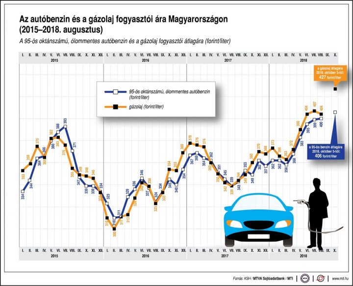 Az autósok 50 forintos különbséget is tapasztalhatnak a töltőállomások árai között. A benzin ára 2012. április elején érte el csúcsát, akkor egy liter átlagosan 451 forintba került. A gázolaj literje 2012. január közepén volt a legdrágább, átlagosan 449 forint.