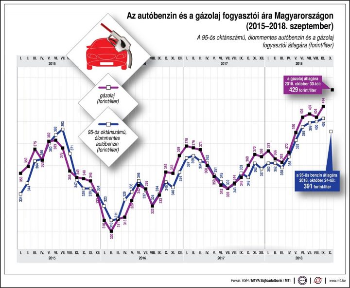 Az autósok 50 forintos különbséget is tapasztalhatnak a töltőállomások árai között. A benzin ára 2012. április elején érte el csúcsát, akkor egy liter átlagosan 451 forintba került. A gázolaj literje 2012. január közepén volt a legdrágább, átlagosan 449 forint.