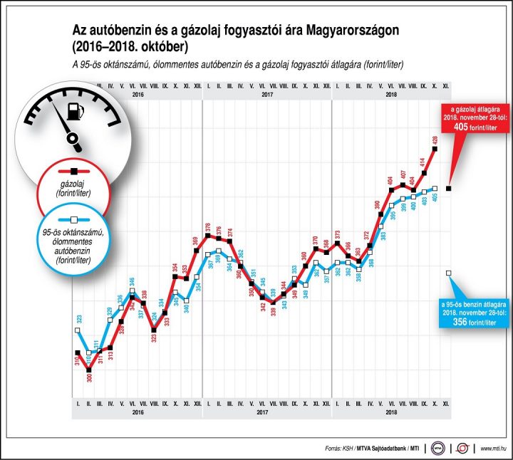 Az autósok 50 forintos különbséget is tapasztalhatnak a töltőállomások árai között. A benzin ára 2012. április elején érte el csúcsát, akkor egy liter átlagosan 451 forintba került. A gázolaj literje 2012. január közepén volt a legdrágább, átlagosan 449 forint.