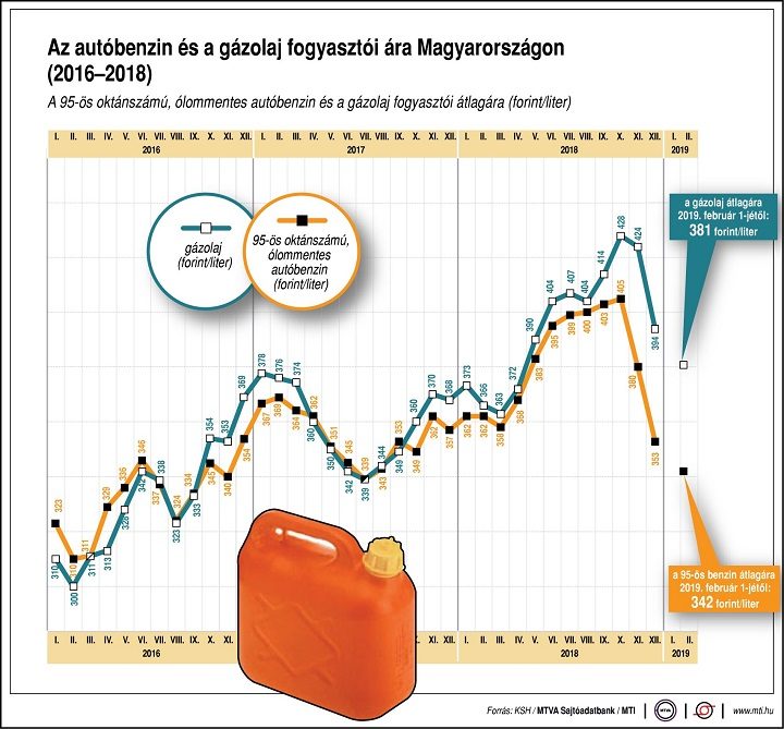 A csökkentéssel a gázolaj literenkénti ára 381 forint, a benziné 342 forint lesz. A gázolaj ára legutóbb múlt szerdán emelkedett, 2 forinttal 384 forintra. A benzin ára január 16-án változott utoljára, 4 forinttal 345 forintra emelkedett.