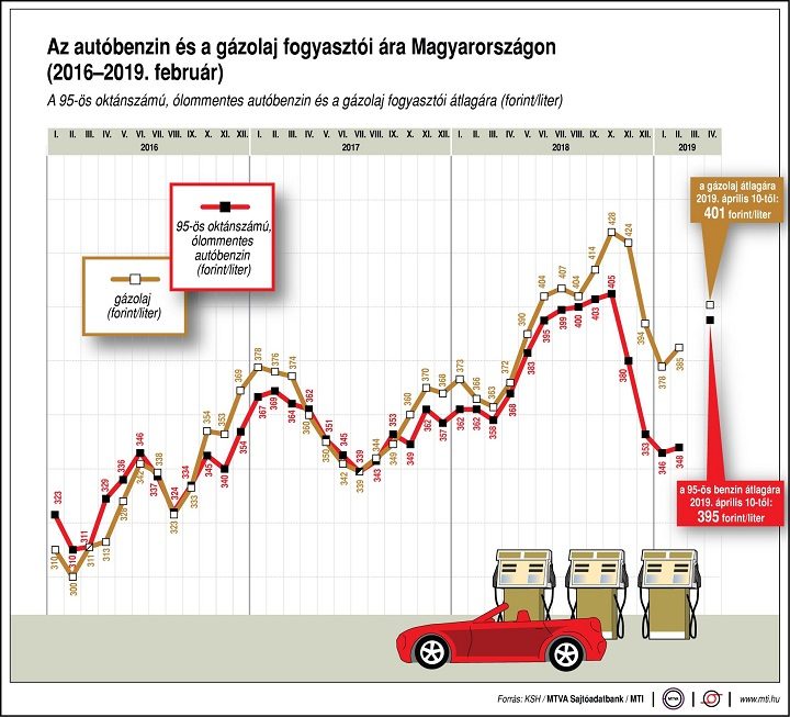Az autósok 50 forintos különbséget is tapasztalhatnak a töltőállomások árai között. A benzin ára 2012. április elején érte el csúcsát, akkor egy liter átlagosan 451 forintba került. A gázolaj literje 2012. január közepén volt a legdrágább, átlagosan 449 forint.