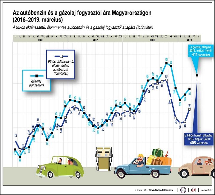 Az emeléssel a benzin literenkénti átlagára 405 forintra, a gázolajé 411 forintra nő. A benzin ára legutóbb április 17-én változott, akkor bruttó 5 forinttal nőtt. A gázolaj ára legutóbb múlt pénteken emelkedett bruttó 2 forinttal.