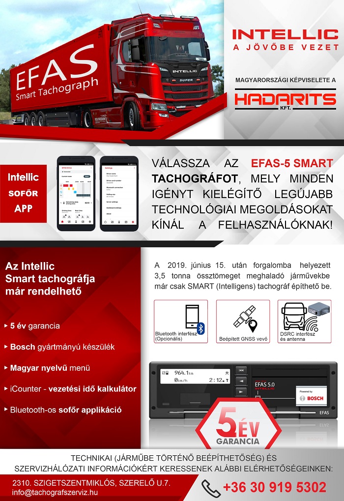 Ajánlatok Hírek Tachográf Válassza az EFAS-5 Smart tachográfot! 2021. február 18. csütörtök (Ezt a cikket 121 alkalommal tekintették meg.) Tags: Ajánlatok, Tachográf Post navigation Previous: Szlovákiában nem kötelező a negatív koronavírusteszt felmutatása a kamionosok számáraNext: Rába: a kiemelkedő negyedik negyedév ellenére csökkent az árbevétel és az eredmény tavaly