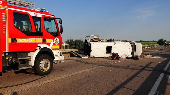 Szolnok Megyei Rendőr-főkapitányság, hozzátéve: a kisbuszban tizennégy magyar állampolgár utazott. A rendőrök teljes útlezárás mellett helyszínelnek, a forgalmat Szolnokra, a Tószegi út irányába terelik. Az Útinform a honlapján azt írta, hogy a környéken hatalmas a torlódás.