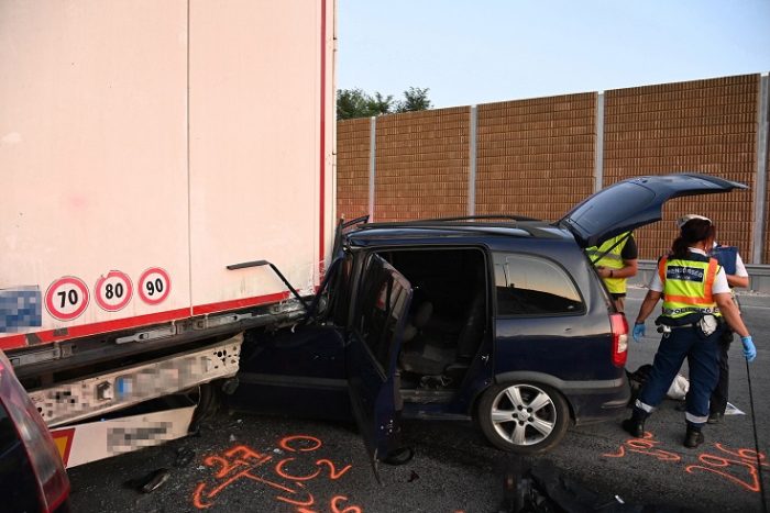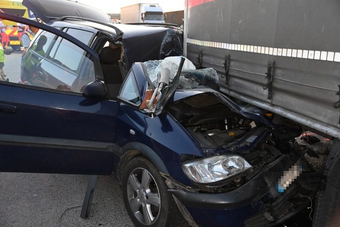 Összeroncsolódott személygépkocsi és sérült teherautó az M0-s autóúton a fõváros XXII. kerületi részén, ahol két személyautó és egy kamion ütközött össze 2021. augusztus 10-én. A balesetben az egyik gépkocsi sofõrje életét vesztette. MTI/Mihádák Zoltán