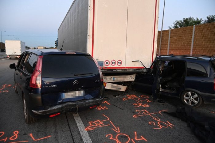 Összeroncsolódott személygépkocsi (j), sérült teherautó és autó az M0-s autóúton a főváros XXII. kerületi részén, ahol két személyautó és egy kamion ütközött össze 2021. augusztus 10-én. A balesetben az egyik gépkocsi sofőrje életét vesztette. MTI/Mihádák Zoltán