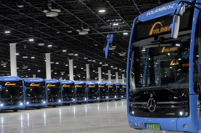 Budapest, 2021. augusztus 31. A Volánbusznak átadott Mercedes-Benz eCitaro elektromos autóbuszok budapesti bemutatójukon a Hungexpo A pavilonjában 2021. augusztus 31-én. A 40 új jármûvet a Zöld busz program keretében szerezték be. MTI/Soós Lajos