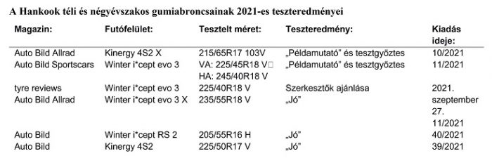 A Hankook-gumiabroncsok egész évben tökéletes választást jelentenek a fogyasztók számára. Ez derül ki a jól ismert magazinok által végzett független gumiabroncstesztek eredményeiből. Az Auto Bild Sportscars (amely Európa legnagyobb autós magazinja, az Auto Bild sportautókkal foglalkozó almagazinja) által végzett idei téli gumiabroncstesztek során a prémium gumiabroncsgyártó lett az első helyezett az ultramagas teljesítményű i*cept evo 3 téli gumiabroncsával. Az Auto Bild Allrad (az Auto Bild magazin négykerék-meghajtású autókról szóló almagazinja) szintén egy Hankook-terméket választott tesztgyőztesnek: a Kinergy 4S 2 X gumiabroncsot.