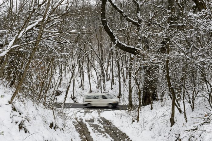 Autók haladnak a Hunyadi János utcán Pécsen, a behavazott Mecsekben 2018. február 3-án. MTI Fotó: Sóki Tamás