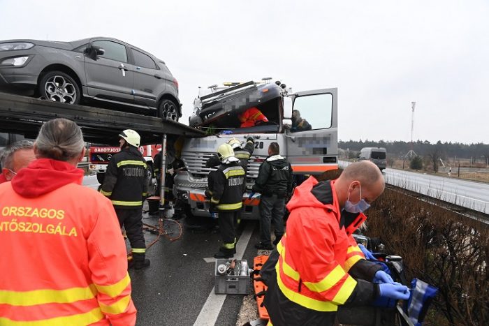 Inárcs, 2022. március 31. Tûzoltók az M5-ös autópálya Budapest felé vezetõ oldalán, Inárcs közelében, ahol összeütközött két kamion 2022. március 31-én. A balesetben egy ember megsérült. MTI/Mihádák Zoltán