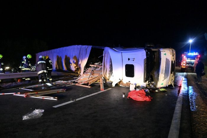 Üllõ, 2022. július 18. Oldalára dõlt kamion az M4-es autóúton Üllõnél 2022. július 18-án. Az M0-s csomópontjánál egy nyergesvontató és két személygépkocsi összeütközött. A balesetben több ember megsérült. MTI/Mihádák Zoltán