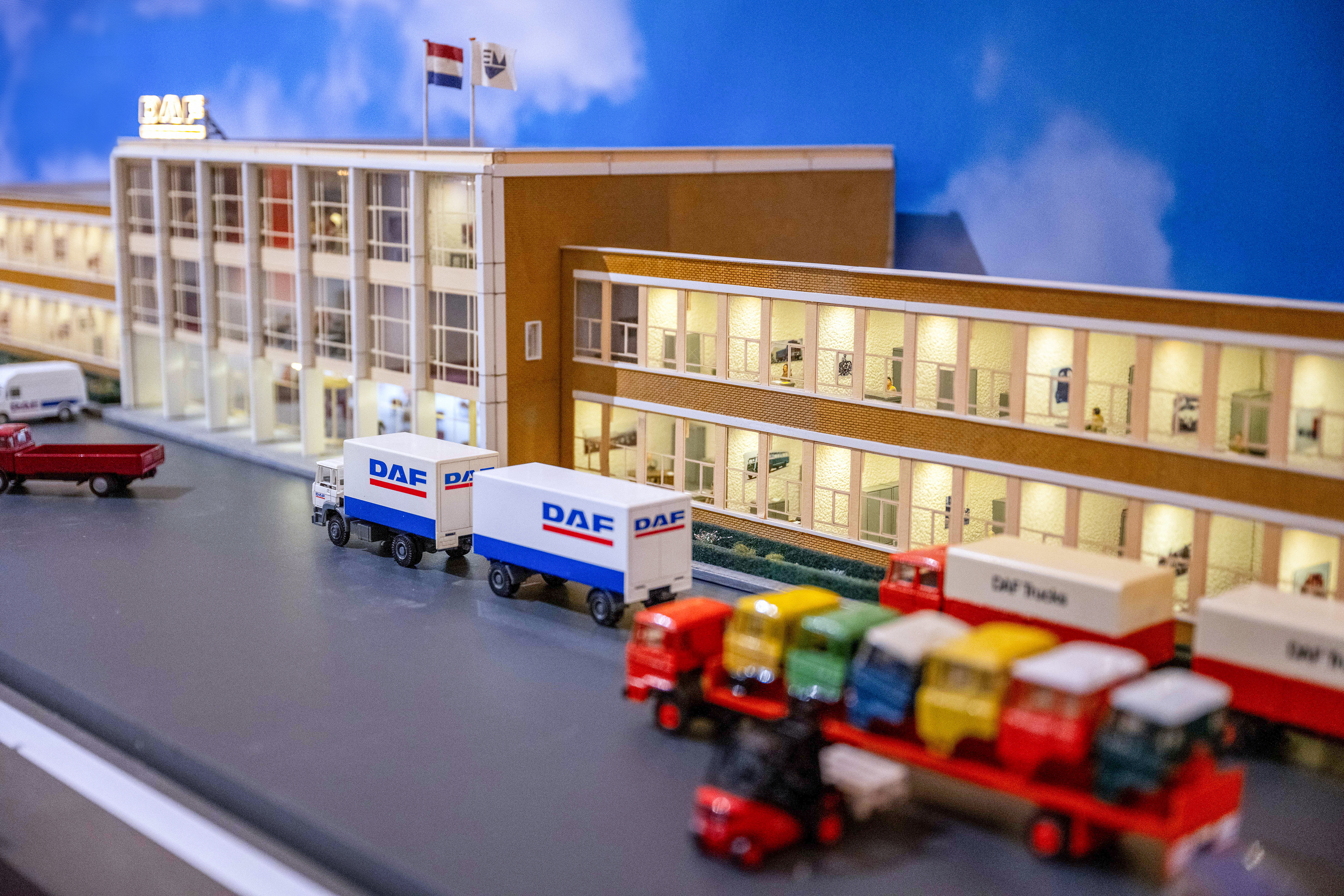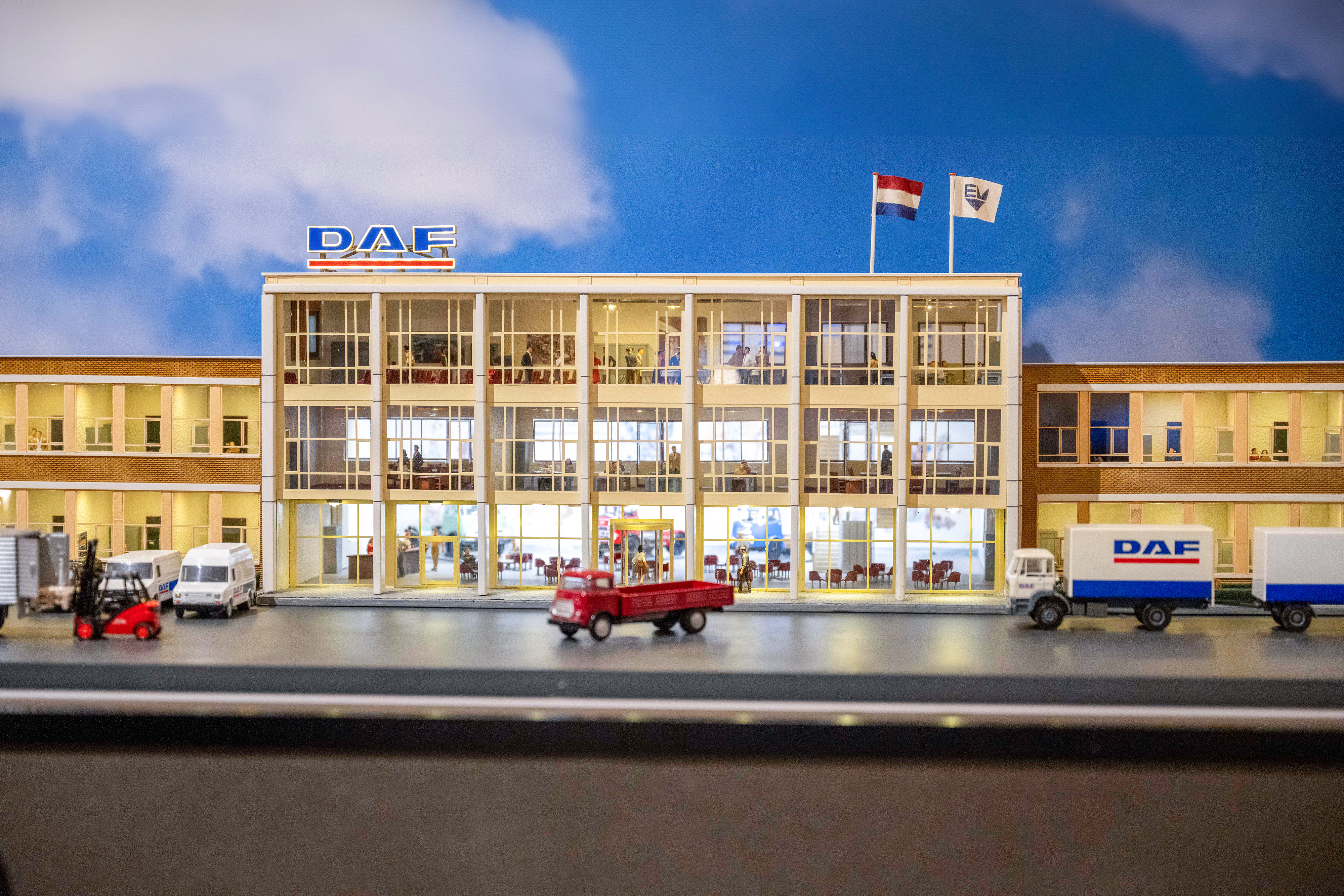 Ha belépünk az eindhoveni DAF-múzeumba, szó szerint eltéveszthetetlen a DAF eindhoveni történelmi főépületének hatalmas, fantasztikusan kivitelezett és rendkívül részletgazdag makettje. Az építője Rien Gerrits, a DAF egykori alkalmazottja; 2018 óta a DAF-múzeum 200 önkéntesének egyike.